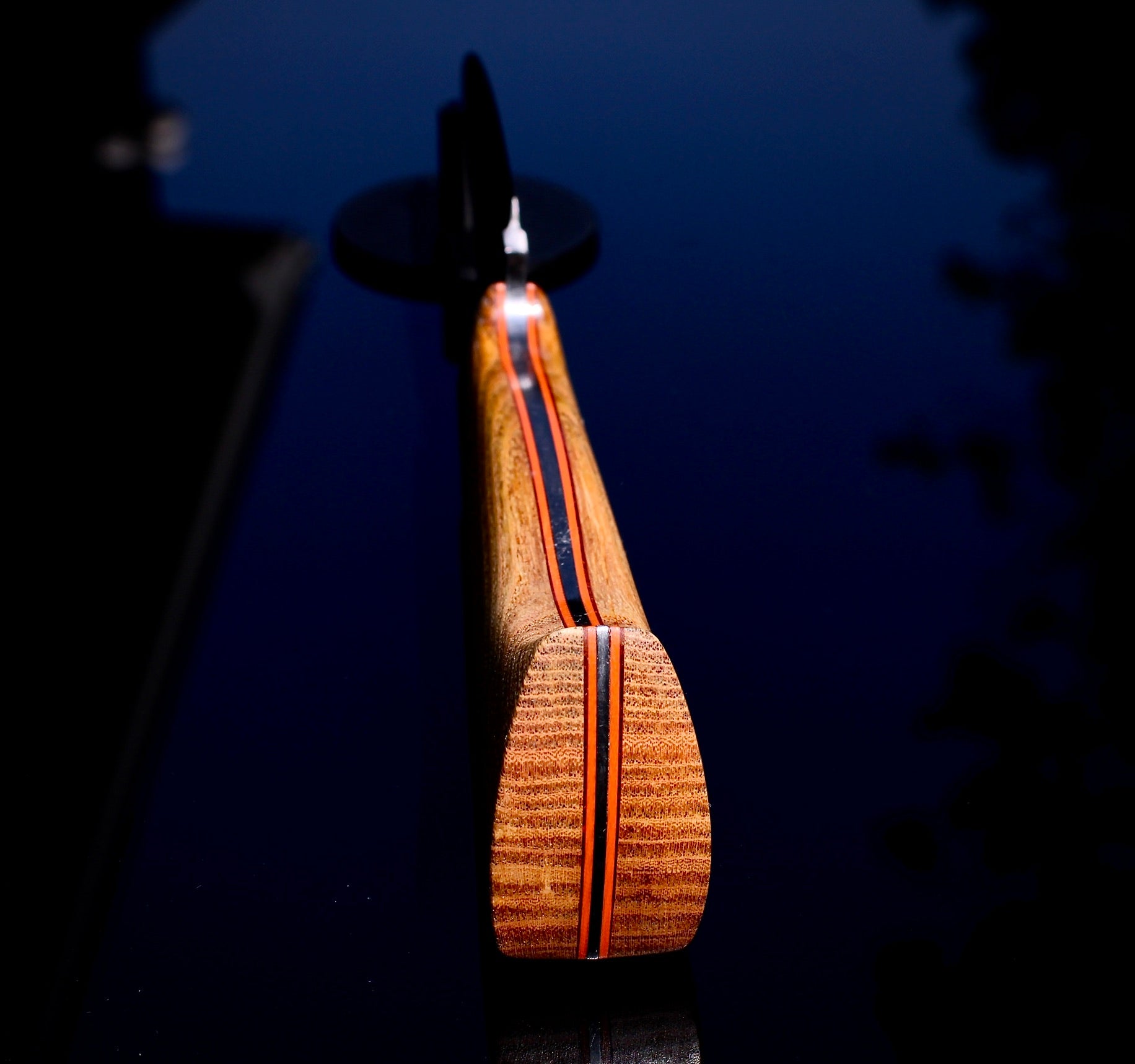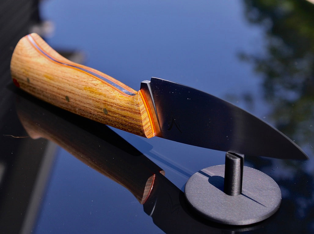 This blade was forged with 1084 steel. The over all length is 9" and has a 4" cutting edge. I used black locust for the handle and it is highlighted with orange g10 liners, an orange g10 lanyard tube and brass pins. I can make a leather sheath for a right or left handed person when the blade is bought.